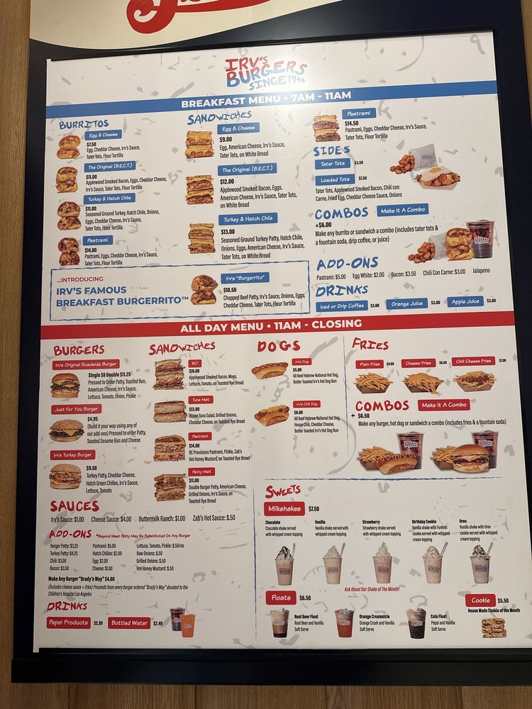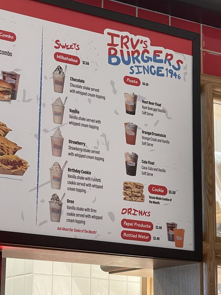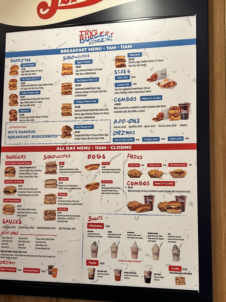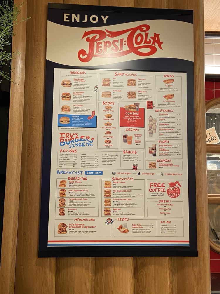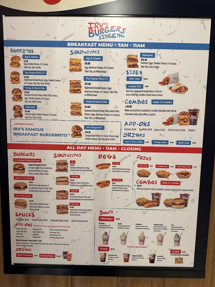 Introducing the menu at Irv's Burgers, located in Las Vegas, where American classics like burgers, sandwiches, and hot dogs are served with a twist. Customers rave about the quality of the ingredients, from fresh toppings to perfectly seasoned patties. The Original Roadside burger and traditional chili dog are standout items, along with crispy tater tots and thin-cut fries. The menu offers limited vegetarian options, making it a go-to spot for meat lovers. With options for customization and a variety of combo meals, Irv's Burgers caters to a range of tastes. The casual, trendy atmosphere and fast service make it a popular choice for a quick bite or dining with friends. Don't miss out on their pressed-to-order patties, flavorful sauces, and nostalgic drinks like the Orange Creamsicle. Irv's Burgers is a must-try for those seeking classic American fare with a modern twist.