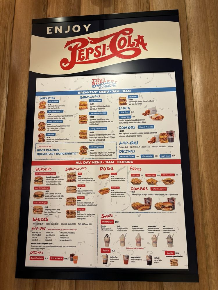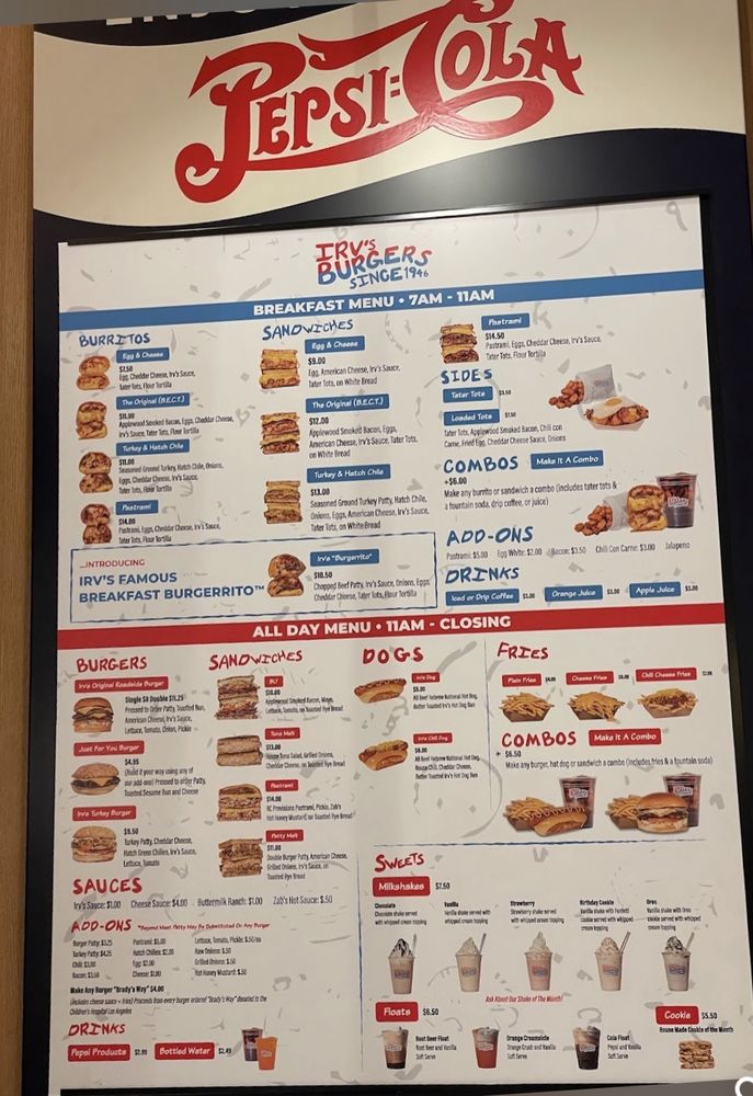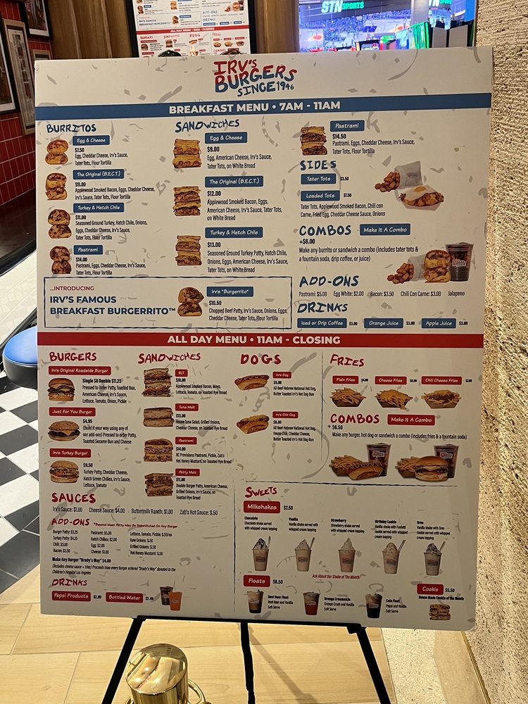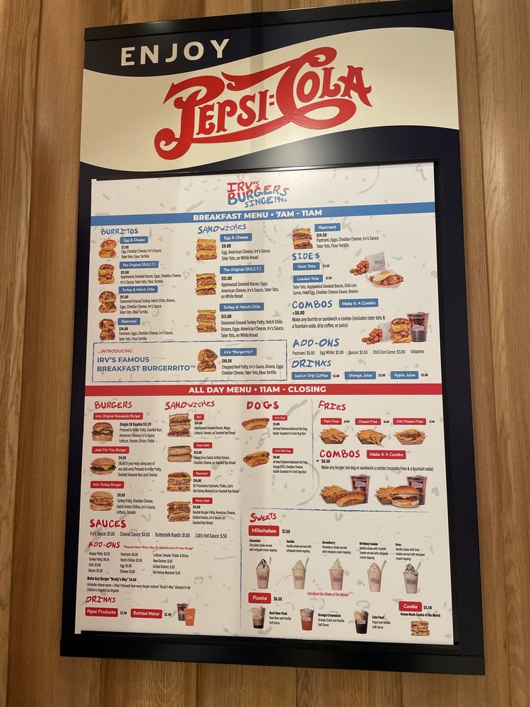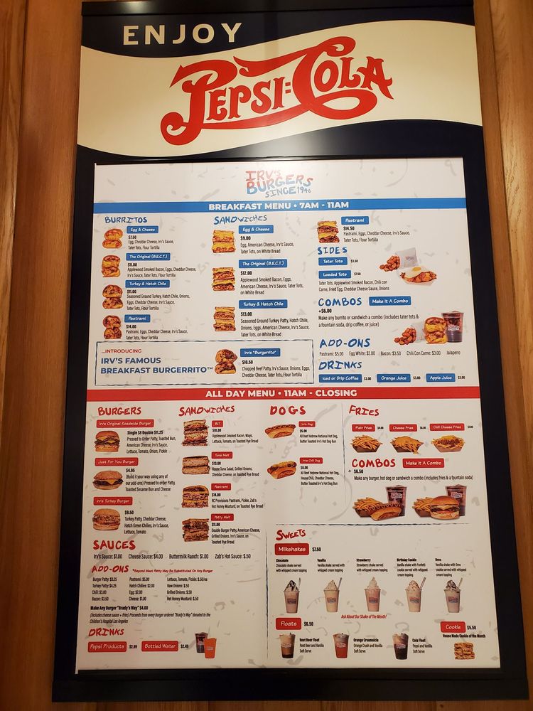 Introducing the menu at Irv's Burgers, located in Las Vegas, where American classics like burgers, sandwiches, and hot dogs are served with a twist. Customers rave about the quality of the ingredients, from fresh toppings to perfectly seasoned patties. The Original Roadside burger and traditional chili dog are standout items, along with crispy tater tots and thin-cut fries. The menu offers limited vegetarian options, making it a go-to spot for meat lovers. With options for customization and a variety of combo meals, Irv's Burgers caters to a range of tastes. The casual, trendy atmosphere and fast service make it a popular choice for a quick bite or dining with friends. Don't miss out on their pressed-to-order patties, flavorful sauces, and nostalgic drinks like the Orange Creamsicle. Irv's Burgers is a must-try for those seeking classic American fare with a modern twist.
